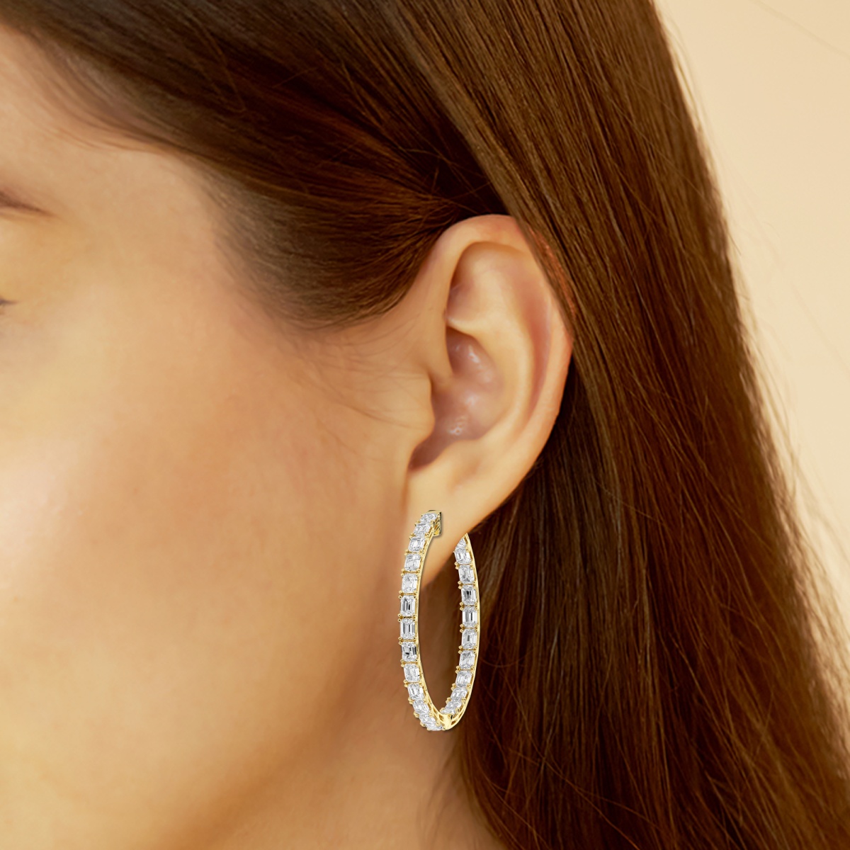 Design: The inside-out design of these hoop earrings ensures that gemstones are visible from all angles, maximizing their sparkle and impact. Lab-grown diamonds are meticulously set along both the outer and inner surfaces of the hoops, creating a continuous line of brilliance that illuminates the wearer’s face. The vibrant green emeralds add a pop of color and sophistication, making these earrings a standout accessory for any occasion.